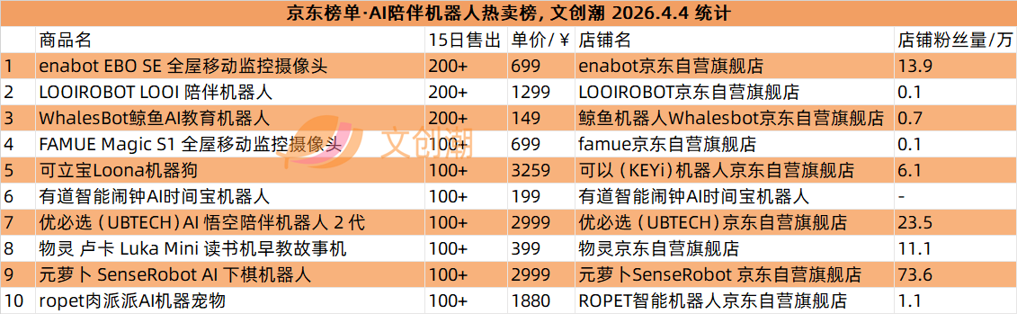 京东榜单每日更新,文创潮4月4日统计到的AI陪伴机器人热卖榜、AI玩具热卖榜前十名,如图所示。