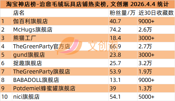 伽百利旗舰店、McHugs旗舰店、熊猫工厂、TheGreenParty官方店、gund旗舰店。