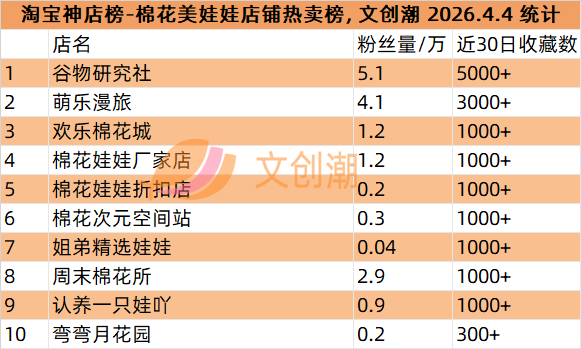 棉花美娃娃店铺热卖榜,前五名分别是: