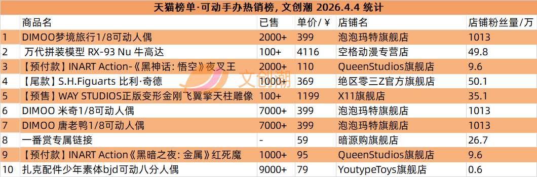再来看看手办的情况,天猫可动手办热销榜第一是泡泡玛特的DIMOO梦境旅行可动人偶。