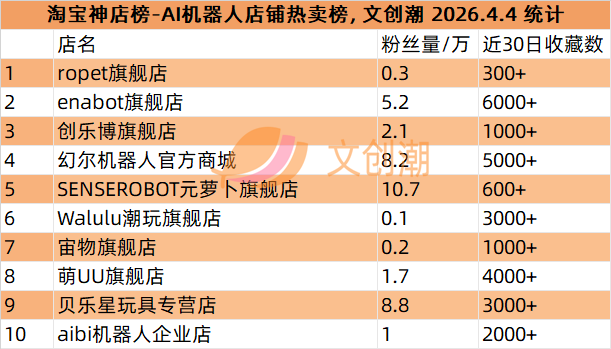 ropet旗舰店、enabot旗舰店、创乐博旗舰店、幻尔机器人官方商城、SENSEROBOT元萝卜旗舰店。