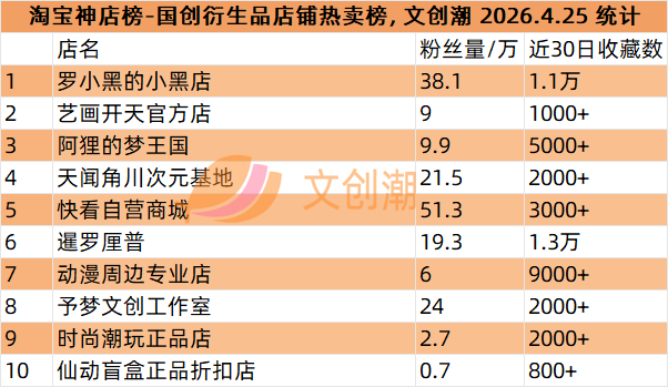 罗小黑的小黑店、艺画开天官方店、阿狸的梦王国、天闻角川次元基地、快看自营商城。