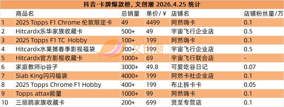 抖音平台榜单每日更新,文创潮4月25日统计到的盲盒、卡牌爆款前十名,如图所示。